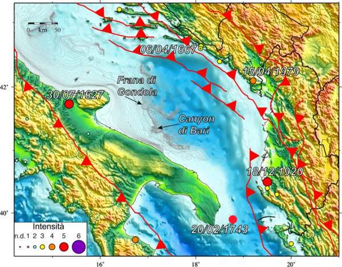 “La Puglia meridionale può essere senz’altro considerata un’area a bassa sismicità. Ciò nonostante essa avverte in maniera sensibile gli eventi sismici con epicentro lungo la costa albanese e in prossimità delle isole Ionie (per es. l’evento del 27 agosto 1886) o ancora più lontano, dell’isola di Creta (evento del 16 febbraio 1810). Meno avvertiti sono i terremoti con epicentro in corrispondenza dell’area appenninica, del Tavoliere e del Gargano. In questo quadro l’evento sismico del 1743 è abbastanza singolare poiché l’epicentro è situato in mare e a tutt’oggi non si conosce la struttura tettonica responsabile di questo forte terremoto. Un’analisi degli effetti di questo sisma permette infatti di stimare una intensità del VIII-IX grado della scala MCS che può essere riconducibile ad una magnitudo compresa tra 6 e 7 gradi della scala Richter”.