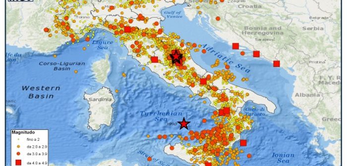 Come già detto, la sismicità prima del 24 agosto ha rispecchiato l’andamento degli ultimi anni in particolare gli ultimi mesi del 2015 con un numero mensile di terremoti intorno al migliaio, pochi eventi di magnitudo maggiore di 4.0 e qualche piccola sequenza. Nella mappa qui sotto sono visualizzati i circa 8.000 terremoti dal 1 gennaio fino al 23 agosto 2016, gli eventi di magnitudo maggiore o uguale a 4.0 sono davvero pochi e, in maggior parte, localizzati al di fuori dei confini nazionali o in mare.