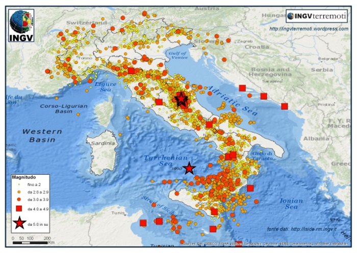 Tra questi ricordiamo il terremoto di magnitudo Mw 4.2 del 6 gennaio localizzato in provincia di Campobasso in un’area interessata da una sequenza con circa 200 eventi registrati solo nel mese di gennaio. Altre due piccole sequenze sono state registrate in questi primi mesi del 2016: la prima in Sicilia orientale tra le province di Ragusa e Siracusa con oltre 30 eventi localizzati dal 6 febbraio con l’evento di magnitudo maggiore (Mw 4.2) avvenuto l’8 febbraio e nettamente risentito in una vasta area della Sicilia orientale; la seconda avvenuta nell’area a nord del lago di Bolsena, tra le province di Terni e Viterbo, con l‘evento principale del 30 maggio di magnitudo Mw 4.1 e oltre 45 terremoti verificatisi tra il 30 e il 31 maggio di magnitudo mediamente basse.