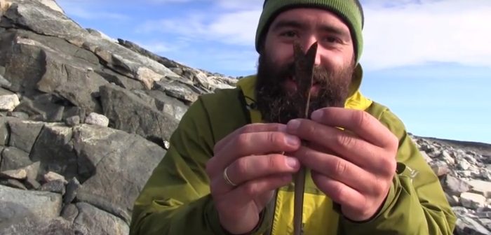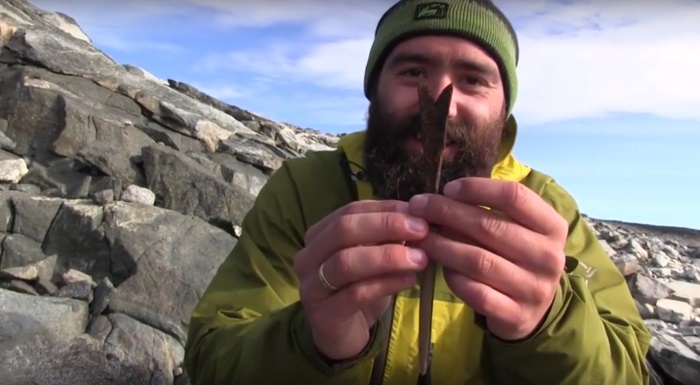 “Si tratta di un esemplare raro, un punta di uccello”, dice Martinsen, mentre raccoglie una punta di freccia misteriosa da terra. La freccia ha un aspetto molto speciale. La punta è divisa a metà, come due lame di coltello una di fronte all’altra.