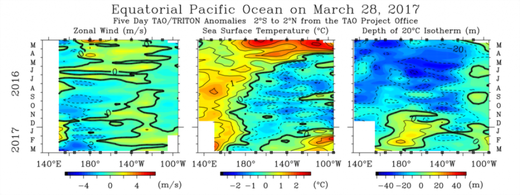 Fig.1 – Anomalia di temperatura nelle acque superficiali (SST) del Pacifico equatoriale il 28 marzo 2017