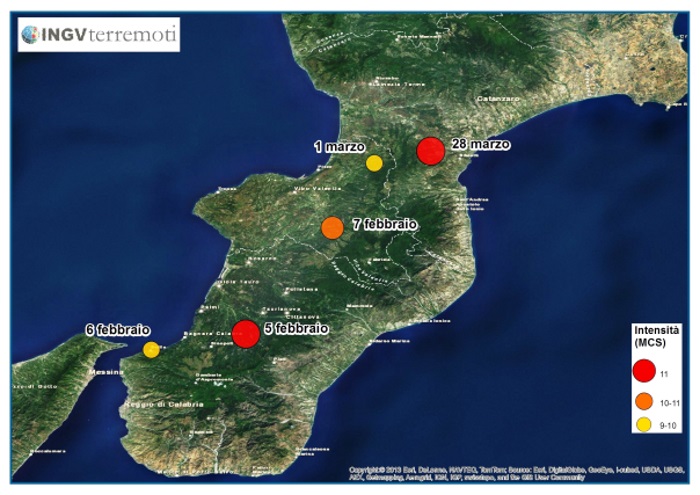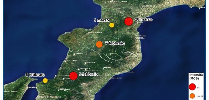 Tra il 5 febbraio e il 28 marzo si verificarono 5 scosse fortissime (5 febbraio, 6 febbraio, 7 febbraio, 1 marzo e 28 marzo 1783) e diverse centinaia di scosse minori, i cui effetti complessivi furono devastanti sulla maggior parte del territorio calabrese e in Sicilia nord-orientale. Le scosse più violente colpirono dapprima (5 e 6 febbraio) la Calabria meridionale, investendo tutta l’area dell’Aspromonte e dello Stretto di Messina, poi (7 febbraio, 1 e 28 marzo) la Stretta di Catanzaro, cioè l’area compresa tra il golfo di Sant’Eufemia e il golfo di Squillace.