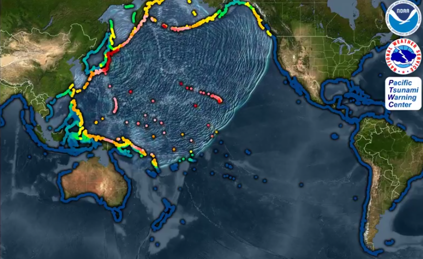 Questa animazione mostra questi valori attraverso il movimento simulato delle onde mentre viaggiano attraverso gli oceani del mondo e si può vedere anche la distanza tra le creste successive dell’onda (lunghezza d’onda), così come la loro altezza (mezza ampiezza) indicata dal loro colore. Ancora più importante, il modello mostra anche cosa succede quando queste onde di tsunami colpiscono la terraforma, informazioni che servono al PTWC per emanare bollettini di pericolo tsunami per le coste colpite.