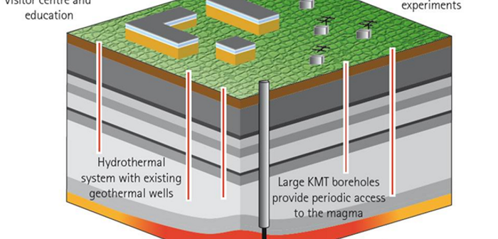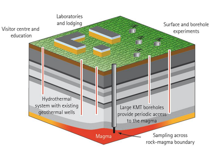 Schema dell’infrastruttura KMT, costituita da una serie di pozzi dotati di strumentazioni ed estesi all’interno e intorno al corpo magmatico a 2,1 chilometri di profondità al di sotto della caldera del Krafla, in Islanda, da una serie di installazioni in superficie costituite da laboratori e centri di elaborazione dati, alloggi e foresteria, centro visitatori e centri di alta formazione, e da una rete di strumenti di monitoraggio multiparametrico distribuiti sulla superficie e all’interno dei pozzi