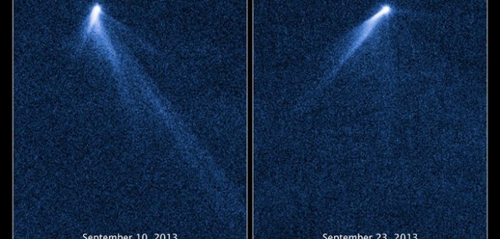 Due immagini catturate da Hubble Space Telescope dove è chiaramente visibile una coda di polvere prodotta da un asteroide. In questo caso si tratta di P/2013P5. Crediti: NASA/ESA.