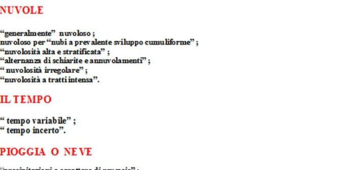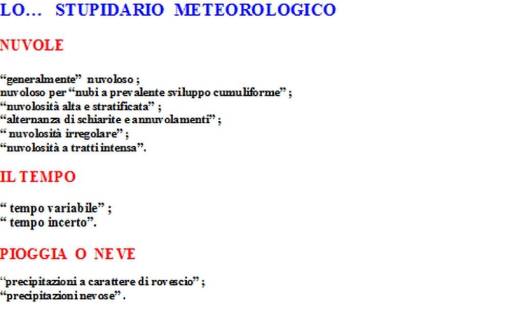 Non credo che i meteorologi quando la mamma chiede loro che tempo farà all’indomani, risponderanno così: “Domani al Centro vi sarà nuvolosità alta e stratificata mentre al Nord vi saranno “precipitazioni nevose”, a tratti anche intense; al Sud invece vi saranno “manifestazioni temporalesche” (“manifestazioni” organizzate…dai sindacati?)