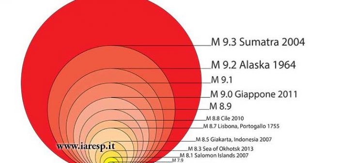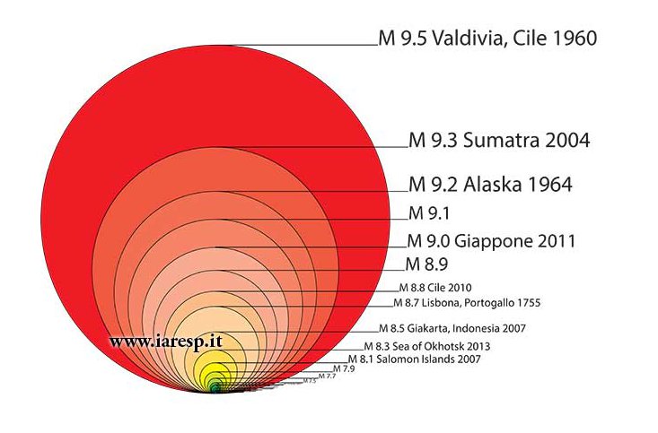 La superficie quadrata dei cerchi raddoppia per ogni due decimi di grado di magnitudo e graficamente rende l’idea della corretta differenza di energia che i vari terremoti sono in grado di sprigionare.