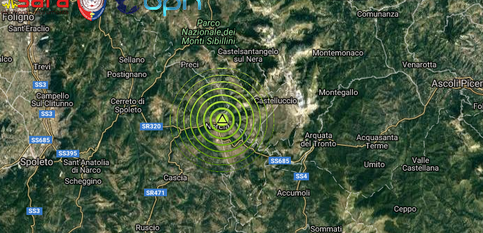 Due scosse di terremoto di Ml 3.0 e Ml 2.7 sono state registate nella notte, nello spazio di due minuti, nella zona di Norcia (PG). Il primo evento, il più forte è stato registrato alle ore 00:35:09 con ipocentro alla profondità di 10 km, mentre il secondo evento, di Ml 2.6, è stato registrato alle ore 00:36:12 con ipocentro alla profondità di 10,8 km.