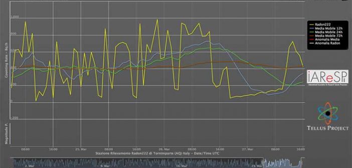 Il Radon è anche moderatamente solubile in acqua e la sua solubilità aumenta al diminuire della temperatura. Variazioni della concentrazione di Radon nell’acqua di sorgenti e nel suolo, interpretabili come fenomeni transienti, sembrano essere correlate a episodi di deformazione crostale che possono concludersi con un evento sismico. I primi tentativi di utilizzare il Radon come “Precursore Sismico” risalgono al 1927 in Giappone. In letteratura sono riportati molti casi di anomalie che hanno preceduto eventi sismici, di solito evidenziati da analisi eseguite dopo il terremoto per la mancanza di un’acquisizione in tempo reale. Attualmente, in Italia, sono attivi alcuni siti di acquisizione di Radon in acqua e in suolo, gestiti da Istituzioni scientifiche e amatoriali, che hanno prodotto delle serie temporali consistenti.
