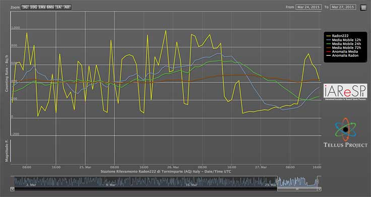 dove M è la minima magnitudo richiesta per ottenere un’anomalia di Radon alla distanza D (km). Questa relazione da anche un’indicazione della grandezza della zona coinvolta nel processo di preparazione del terremoto.