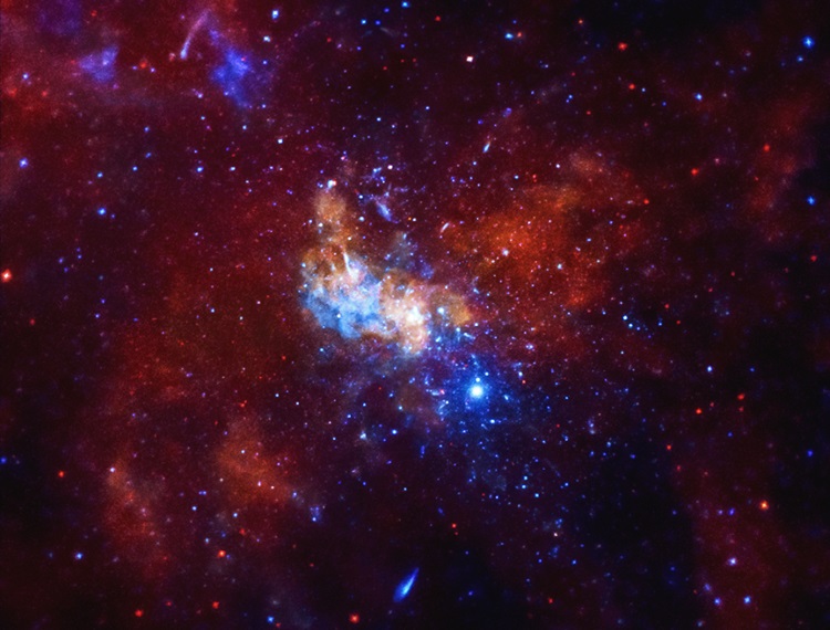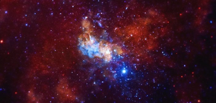 Il centro della Via Lattea: nel riquadro è evidenziata la posizione di Sagittarius A* (NASA/UMass/D.Wang et al., IR: NASA/STScI)