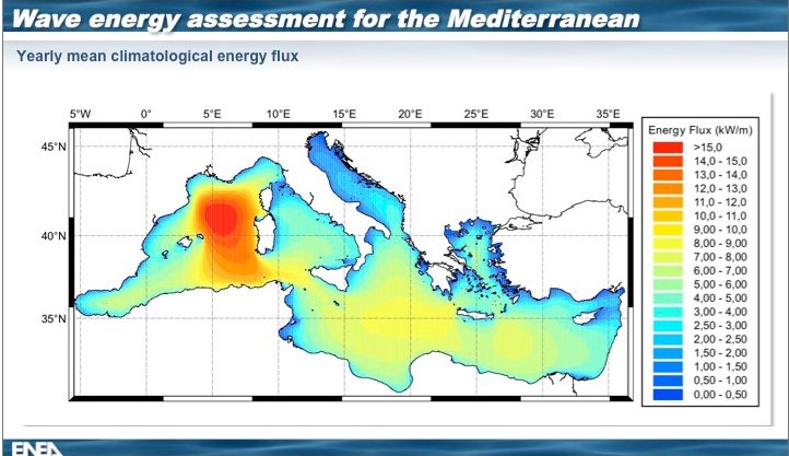 Dalle elaborazioni Enea emerge che «Il maggiore potenziale energetico del mare della Sardegna occidentale è il doppio rispetto a quello del Canale di Sicilia (7 kW/m), oltre tre volte superiore ai 4 kW per metro di costa del basso Tirreno, più che quadruplo di quello di Ionio e Medio Tirreno (3 kW/m) e di circa 6 volte quello del Mar Ligure (2,5Kw/m) e dell’Adriatico (2 kW/m in media)».
