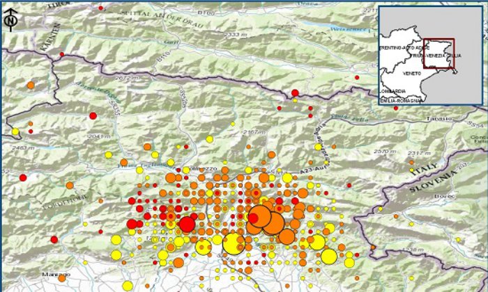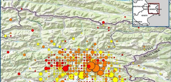 La figura sopra mostra bene le due fasi principali della sequenza del Friuli del 1976, a cui fece seguito un’ulteriore ripresa nella seconda metà del 1977. Se guardiamo alla distribuzione degli epicentri dell’intera sequenza, vediamo che tra maggio e settembre del 1976 c’è una chiara migrazione dalla zona centrale verso est. Molto probabilmente ciò sta a indicare che si sono attivati dei sistemi di faglia adiacenti. Successivamente, la sismicità del 1977 sembra attivare un’ulteriore porzione del sistema di faglie friulano, visto che gli epicentri di quest’ultima fase sono migrati questa volta verso ovest.
