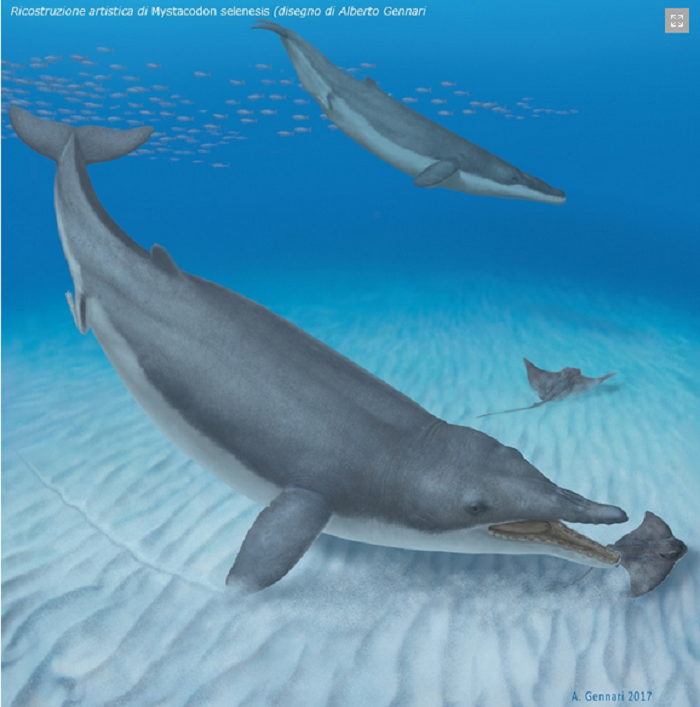 Giovanni Bianucci, paleontologo del dipartimento di scienze della Terra dell’università di Pisa, che ha partecipato allo scavo e allo studio del fossile, spiega che «Quella che abbiamo trovato è una balena molto diversa da quelle che nuotano nei nostri mari, che conserva caratteri primitivi, come la presenza delle zampe posteriori, seppure estremamente ridotte (è stato trovato il bacino molto piccolo), e denti robusti che le sono valsi il nome di “Mystacodon”, che sta a significare “misticeto con i denti”. Il nome della specie “selenensis” evoca invece Selene, la dea della Luna, in riferimento a Media Luna, la località in cui è stato scoperto il fossile. Inoltre questa balena, come la maggior parte di quelle vissute nel passato, era molto più piccola di quelle di oggi: solo 4 metri, pochi se confrontati con gli oltre 30 raggiunti dalla balenottera azzurra. Dallo studio del suo scheletro siamo arrivati alla conclusione che Mystacodon selenensis probabilmente si nutriva su fondali sabbiosi aspirando piccole prede. Questo tipo di alimentazione è supportato dalla peculiare usura dei denti dovuta all’accidentale ingestione di sabbia durante la cattura delle prede. Anche la pinna pettorale mostra una particolare mobilità utile a dirigere e bilanciare il corpo quando l’animale si spostava in prossimità del fondo».