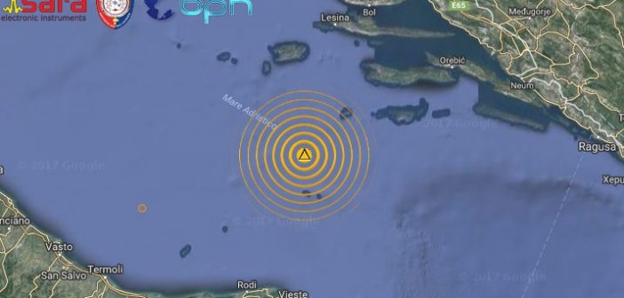 Un terremoto di magnitudo (Ml) 3.3 è avvenuto alle ore 17:43:11 ed è stato localizzato in mare Adriatico, molto al largo della costa Abruzzese con ipocentro alla profondità di 29 km. L’epicentro è stato rilevato in mare a nord-est delle Isole di Pelagosa (Croazia)