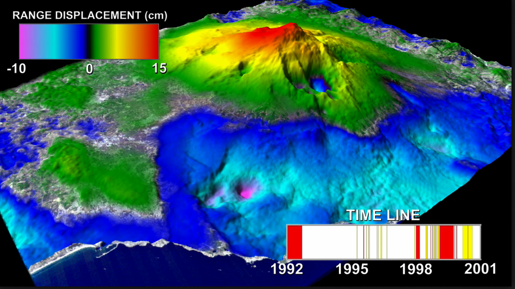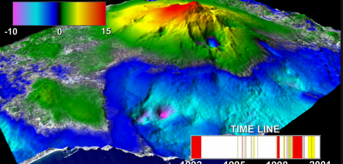 Davvero molto interessante l’animazione realizzata dalla Nasa, attraverso la tecnica SAR (synthetic aperture radar) che mostra la deformazione del suolo dell’area del monte Etna tra il 1992 e il 2001. Tanto per citare ciò che è accaduto nel periodo preso a riferimento dal video, l’Etna nel lasso di tempo che va dal 1991 al 1993 fu interessato dall’eruzione che minacciò la città di Zafferana, mentre il periodo 1995-2001 fu caratterizzato da una intensa attività sui crateri sommitali. La deformazione al suolo che si vede nel video è legata al’espansione (e contrazione) della camera magmatica del vulcano durante questi episodi eruttivi.