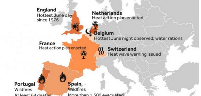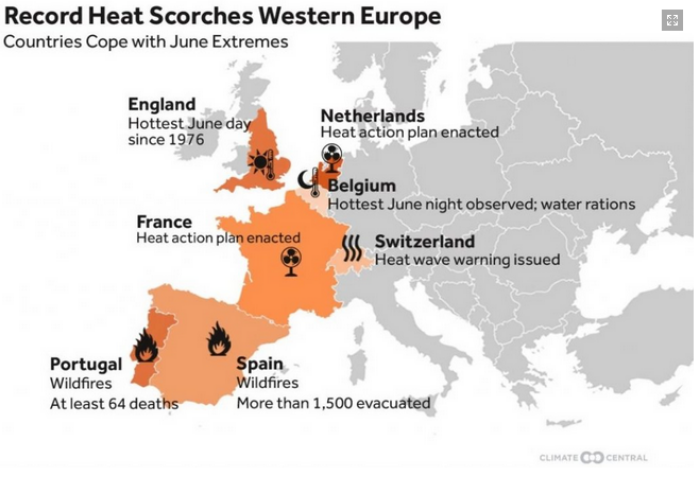 Il mese di giugno è stato caratterizzato da estremamente alte temperature e incendi in tutta l’Europa occidentale. In Portogallo, un incendio boschivo mortale ha ucciso almeno 64 persone e ne ha ferite più di 200. In Spagna un grande incendio boschivo ha costretto più di 1.500 persone ad abbandonare le loro case. In Francia , Svizzera e Olanda sono stati attivati i piani di emergenza contro il caldo. L’Inghilterra ha registrato il giugno più caldo dopo la mitica ondata di caldo estivo del 1976.