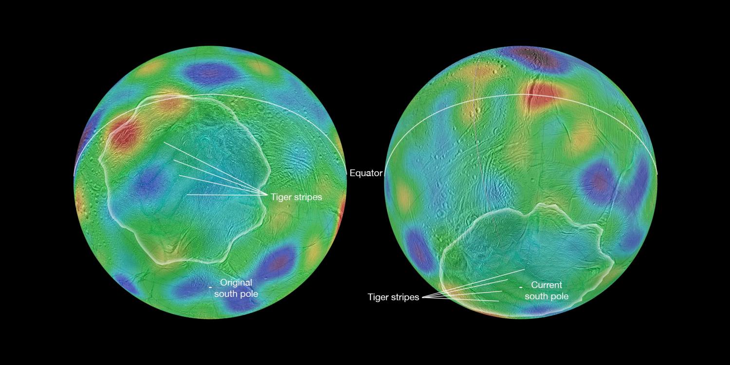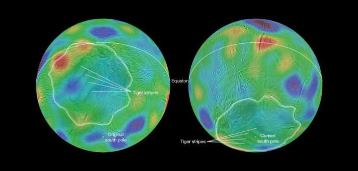 Recenti dati rilevati dalla sonda della NASA Cassini sembrano dimostrare che l’asse di rotazione della luna di Saturno Encelado potrebbe essersi riorientato in un lontano passato, probabilmente a causa della collisione con un corpo più piccolo.