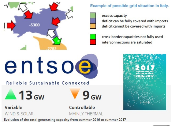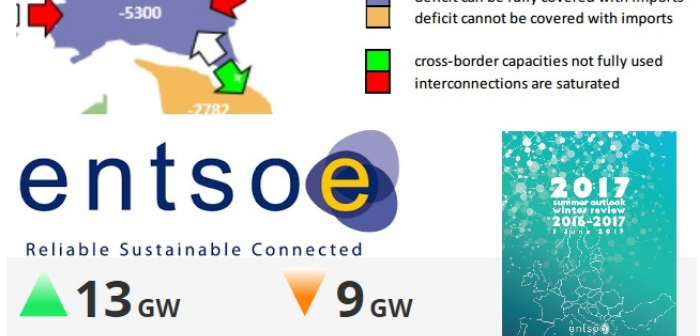 Il rapporto “Summer Outlook 2017 and Winter Review 2016/2017” dell’European network of transmission system operators for electricity (Entso-e) analizza la capacità produttiva totale di energia in Europa e conferma la diminuzione del nucleare e del termico, eccetto il gas, e l’aumento dell’eolico e del solare, ma lancia anche un allarme per questa estate: in Italia, in caso di temperature molto elevate (che stiamo già sperimentando in questo fine primavera) l’adeguatezza delle forniture e l’equilibrio tra produzione e consumo devono essere monitorati per tutta la stagione »
