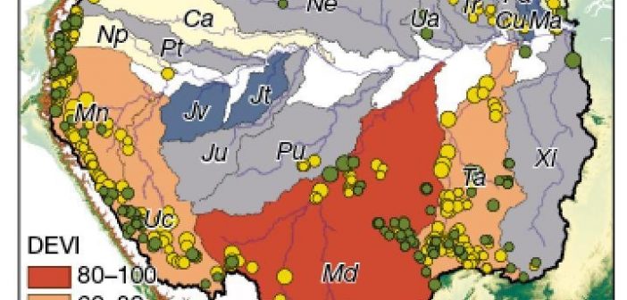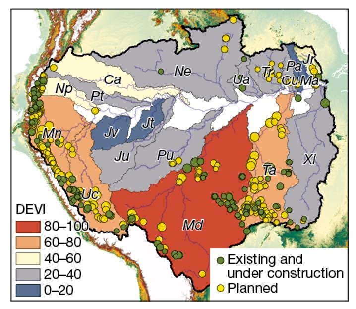 Il risultato è un indice, il DEVI appunto, che consiste in una scala da 0 (minimo impatto) a 100 (massimo impatto). Come si vede in figura, un’ampia area – quella del bacino del Madeira – è nella fascia più a rischio. Con un indice DEVI superiore a 80. A est e a ovest di questo bacino, altre grandi aree a rischio, perché con un indice DEVI compreso tra 60 e 80. Solo in piccolissime aree dell’intero sistema amazzonico l’impatto delle dighe è minimo.