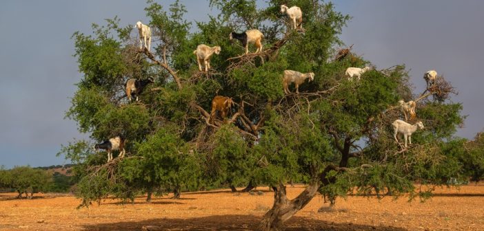 Cosa succede. Nel secco sud del Marocco, è possibile osservare le capre addomesticate arrampicarsi sulla cima degli alberi di Argan alla ricerca di foraggio fresco di cui nutrirsi. In alcuni casi sono gli stessi pastori locali a tagliare gli alberi in modo da agevolare la salita degli animali, in particolare dei capretti che stanno muovendo i loro primi passi. Questa abitudine alimentare è ancor più frequente in autunno quando le capre passano tre quarti del loro tempo in cima agli alberi. E quindi?