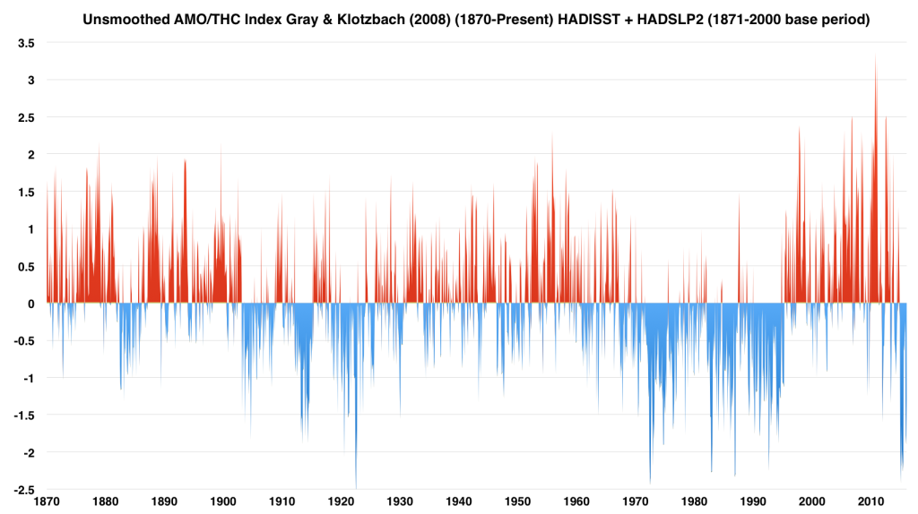 infine l’oscillazione ciclica (anche essa con ciclo di 60 anni) della AMO (Atlantic Multidecadal Oscillation) ovvero della temperatura superficiale delle acque dell’Atlantico