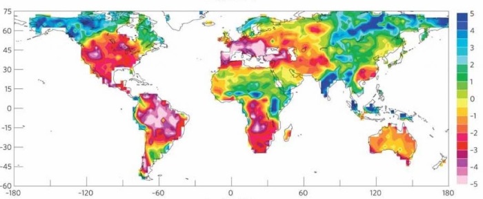 In ogni caso la maggior parte del Pianeta sembra destinata ad andare incontro a episodi di siccità ricorrenti: le colorazioni del rosso e del giallo indicano infatti anch’esse situazioni a evidente rischio siccità, anche se meno insistenti e severe. Il progressivo inaridimento previsto in diverse regioni del Globo sarebbe una conseguenza, per quelle aree, sia di una diminuzione delle piogge causata dal passaggio di un minor numero di perturbazioni sia da una maggior tasso di evaporazione prodotto da temperature via via sempre più alte.