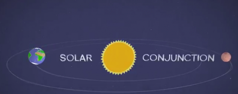 Questa grafica illustra le posizioni di Marte, della Terra e del Sole durante un periodo che si verifica circa ogni 26 mesi. Durante le settimane di congiunzione solare, Marte non è visibile dalla Terra e ogni comunicazione viene interrotta. Crediti: Nasa / Jpl-Caltech