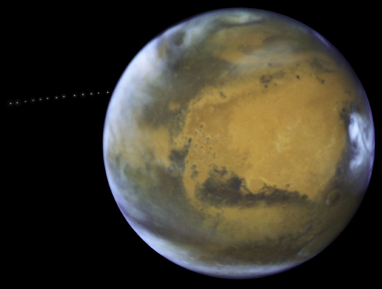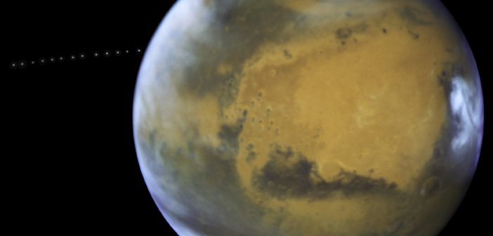Nei 13 scatti distinti raccolti dallo strumento Wfc3/Uvis a bordo del telescopio spaziale la piccola luna marziana è poco più che un bagliore lontano, un puntino luminoso. Ma sono bastati, appunto, 22 minuti per fotografarne il rapido spostamento sull’orbita marziana.