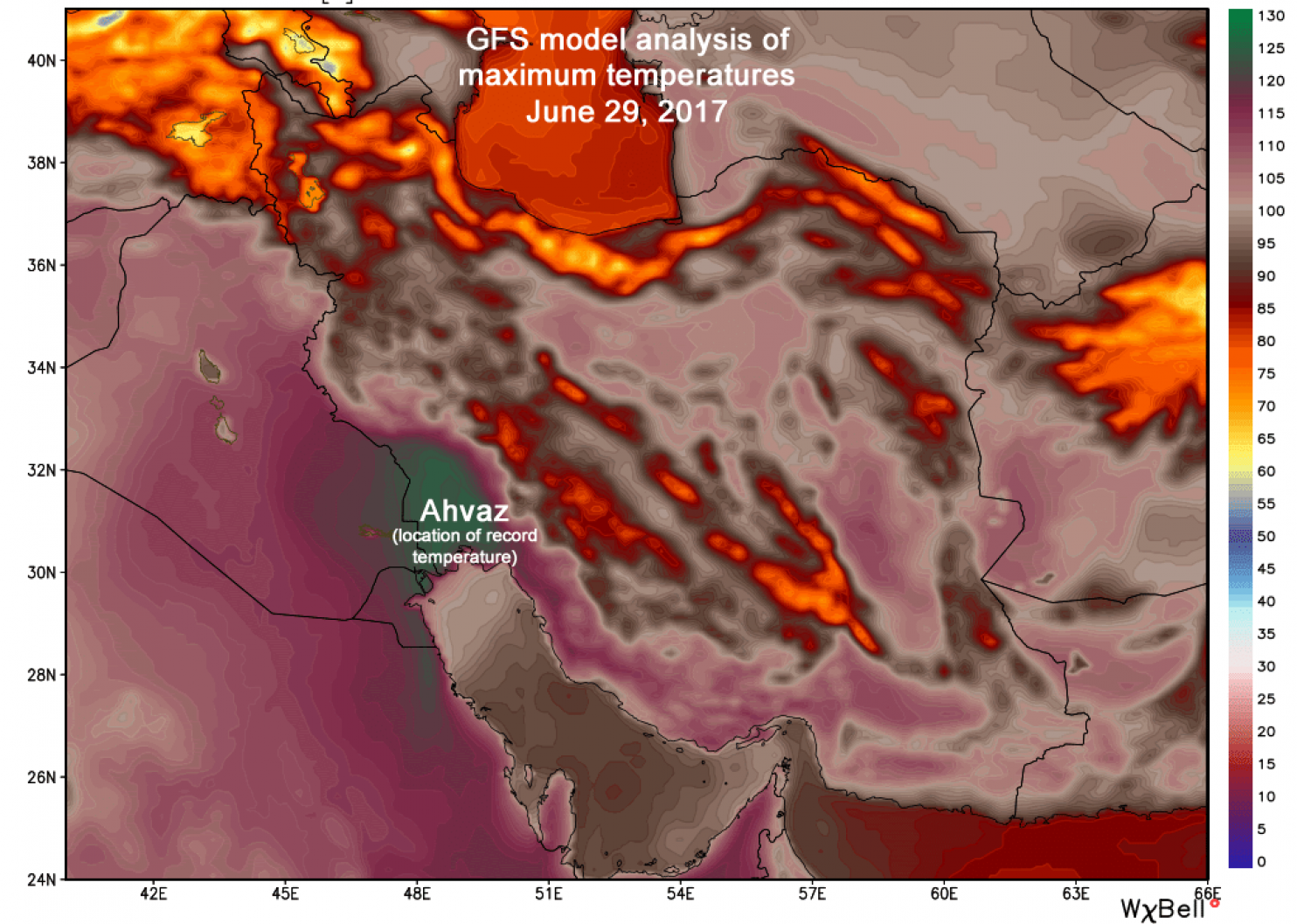WMO will examine reported heat records: 53.7°C at Ahwaz, Iran 29.6.2017, 54°C in Turbat, Pakistan 8.5.2017, 54°C Mitribah, Kuwait, 21.7.2016 pic.twitter.com/hTFCBDrlxL