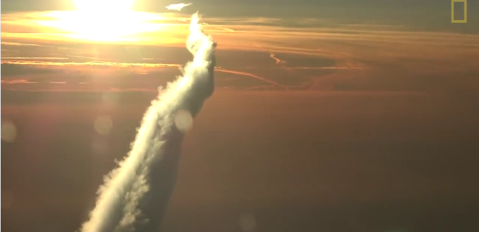 Questo video, pubblicato da National Geographic, è stato ripreso al sorgere del sole dalla plancia di un aereo e mostra il comportamento di una scia di condensazione