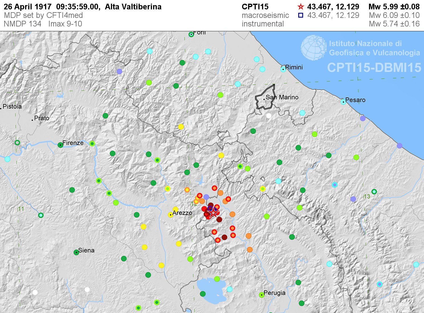 “1917 […] Al mattino del 26 aprile, a partire dalle 5h25m, cominciarono a sentirsi in vari paesi dell’alta valle del Tevere una mezza dozzina di scosse […] assai sensibili che misero in allarme quelle popolazioni, allorché a 10h36m dello stesso giorno [da poco era stata introdotta l’ora legale, Ndr]sopraggiunse una violentissima scossa che assunse tutti i caratteri di un vero disastro soprattutto a Monterchi e frazioni: ivi il 90% delle case si resero inabitabili e la maggior parte di esse crollarono, le rimanenti furono danneggiate più o meno lievemente; si dovettero inoltre deplorare una ventina di morti ed una trentina di feriti […] A Citerna, a Monte S. Maria Tiberina e nella frazione di Lippiano, a Lugnano […] il disastro fu un po’ meno grave, giacché solo il 50% delle case crollarono o si resero inabitabili e non vi furono vittime […] A S. Sepolcro il terremoto fu rovinoso: crollarono una diecina di case, oltre 200 si resero inabitabili, circa 900 rimasero lesionate e le rimanenti ebbero leggere lesioni. A S. Giustino ed Anghiari il danno fu un po’ meno grave, giacché non si verificarono crolli. A Città di Castello, Montone e Umbertide […] lesioni gravi in parecchie case, leggere nelle rimanenti. Ad Arezzo, Badia Tedalda, Bagno di Romagna, Castiglione Fiorentino, Civitella della Chiana, Cortona, Foiano della Chiana e Monte S. Savino si ebbero solo leggere lesioni in alcune case […] Le repliche, numerose nel primo giorno, andarono diminuendo nei giorni successivi e cessarono del tutto al mattino del 9 maggio. La più notevole […] ebbe luogo a circa 13h55m del 27 aprile, ed ebbe tale intensità nella zona epicentrale da provocare la caduta di qualche muro pericolante e rendere più gravi le lesioni prodotte dalla scossa principale del giorno precedente.” [Cavasino, 1935, pp. 160-161]