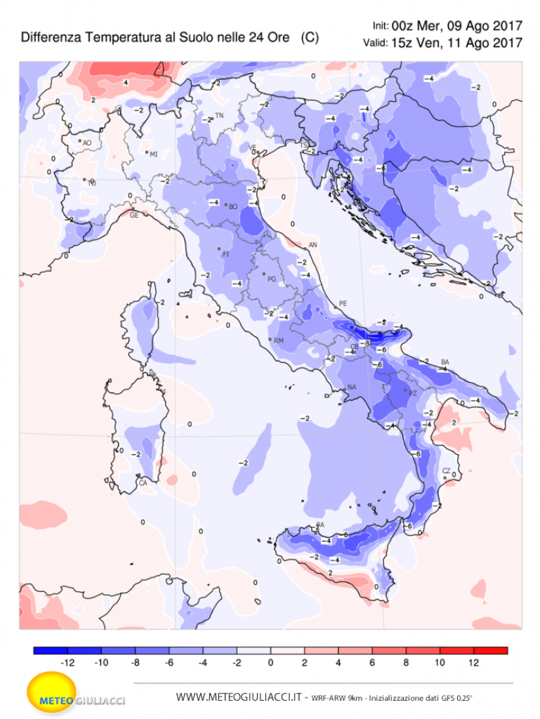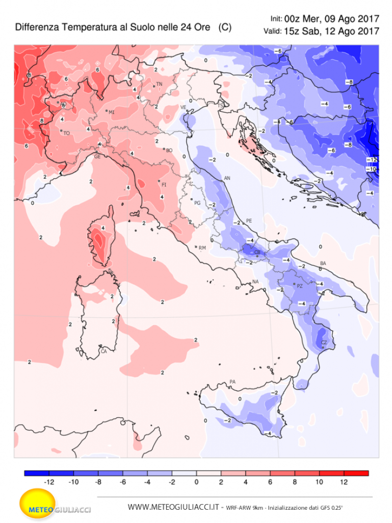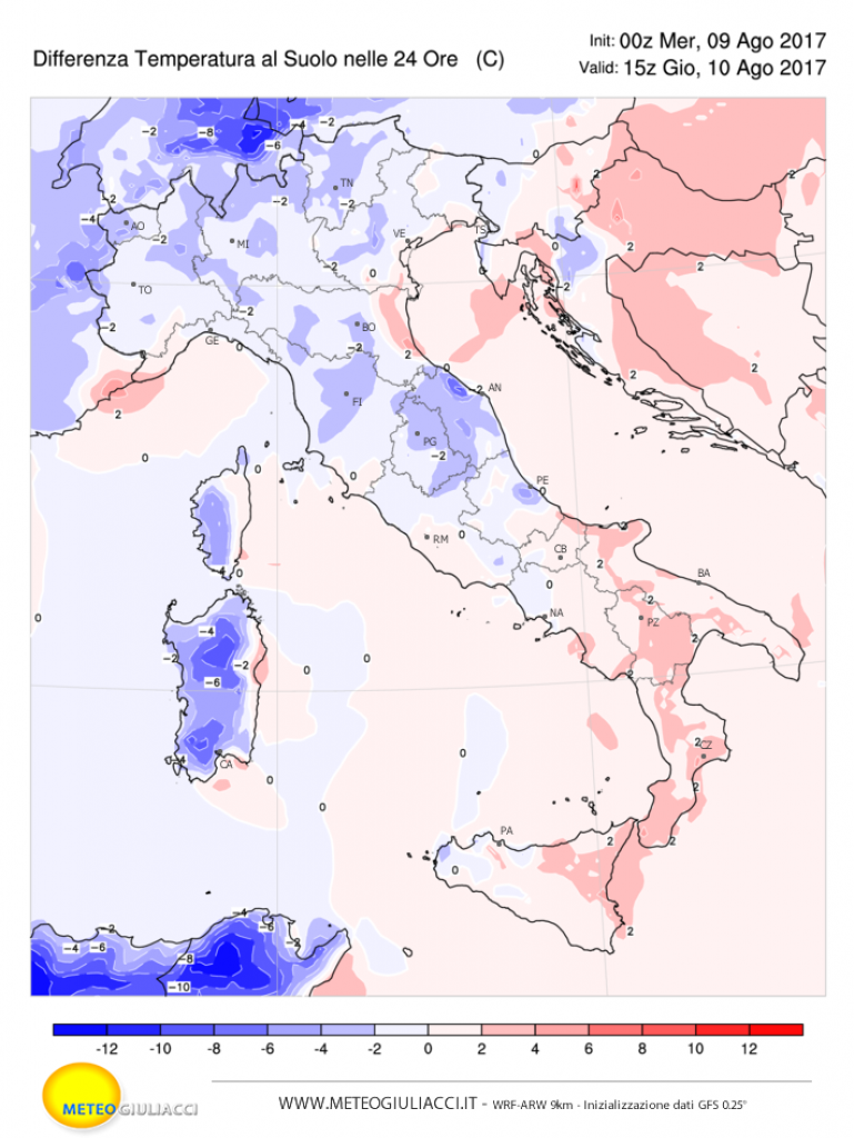 Nelle immagini allegate trovate la differenza termica prevista in 24 ore, quindi rispetto al pomeriggio precedente.