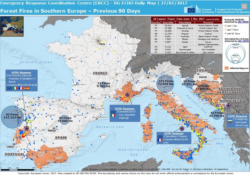 Secondo di dati forniti dal Centro di coordinamento di risposta all’emergenza dell’Ue (l’Ercc), aggiornati al 27 luglio, l’Italia registra uno sgradito primato per quanto riguarda gli incendi: in nessun altro Stato d’Europa sono scoppiati tanti roghi come da noi, 371. Il secondo Paese in questa particolare classifica è il Montenegro, dove però gli incendi documentati sono “appena” 43.