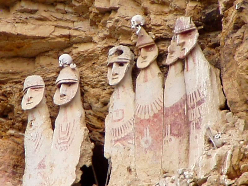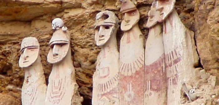 Alcune civiltà minori rimasero isolate, ed in seguito all’espansione imperiale delle grandi civiltà precolombiane che conosciamo, vennero gradualmente assimilate (sorte subita proprio dai Chachapoyas), poi successivamente disperse sul territorio conquistato. Quest’ultima manovra politica di re-insediamento chiamata “mitmac” allontanava dal territorio originale i suoi popoli, che così facendo perdevano gradualmente l’identità ed i contatti con gli altri della propria etnia, e quindi anche eventuali istinti di ribellione. Quando però i Conquistadores arrivarono in zona, gli Incas avevano da poco conquistato/occupato i territori del Popolo delle Nuvole. Quest’ultimo approfittò quindi dei nuovi arrivati per allearsi con loro contro gli oppressori imperiali facendo da apripista, da guide locali e persino combattendo al loro fianco. Gli autori spagnoli descrissero questo popolo come europei dal bell’aspetto ma con caratteristiche somatiche degli indigeni, dissero che le donne erano talmente belle da incantare gli uomini, e che questo spesso costava loro la schiavitù e matrimoni forzati con l’Inca e la casta dei nobili. Adesso però parleremo delle sepolture del popolo Chachapoyas che sono alle origini del mio interessamento alla questione. Per mantenere i propri riti funerari ed il proprio modo di seppellire i defunti, il “Popolo delle Nuvole” sfruttava le caverne sulle scogliere a picco, luogo non solo di difficile accesso, ma anche difficile da individuare se non conosciuto. Per fare un esempio di una famosa sepoltura di questo enigmatico popolo, possiamo parlare dei “Sarcofagos ò Purumachos de Karajia” dove osserviamo alcune incredibili statue erette, antropomorfe figure che sono praticamente quasi identiche ai Moai dell’Isola di Pasqua, scolpiti invece dai “Rapa Nui”. La differenza principale delle due tipologie di sculture sta essenzialmente nel materiale: mentre i Moai sono pietre megalitiche scolpite, le sculture funerarie dei Chachapoyas sembrano invece essere fatte di materiale impastabile come argille colorate e cotte al sole. Persino i copricapi ancora visibili in queste figure sono simili a quelli delle sculture dell’isola del Pacifico. Scavando nella cultura di questo popolo andino, si scopre che anche le sculture rituali, le maschere, ecc., somigliano in modo incredibile ai Moai. Tempo fa espressi una mia tesi sui popoli Rapa Nui, i Moai e la fine della civiltà dell’Isola di Pasqua, isola che un tempo doveva essere decisamente molto più estesa di ora. La mia teoria parlava di un mega tsunami di centinaia di metri che spazzò via parte dell’isola e interrò gran parte delle sculture (che dovevano essere guardiani che proteggevano qualcosa che doveva stare sulla parte più alta dell’isola stessa) con la terra trasportata dalla stessa onda. Oggi si sa (e lo feci notare anche io all’epoca) che dietro questi colossi ci sono raffigurazioni simili alle arcaiche tavolette di argilla sumere che narrano degli Annunaki, simili tra l’altro anche ad alcune raffigurazione degli Shardana della Sardegna (di recente è stata trovata proprio nell’isola una tomba in una caverna marina dove all’interno sono presenti reperti identici a quelli sumeri e trattano di un popolo marinaro) conosciuti in tutto il Mar Mediterraneo, e molto simili anche alle raffigurazioni Maya ed Azteche dei popoli marinari che tentarono l’invasione del Sud America.