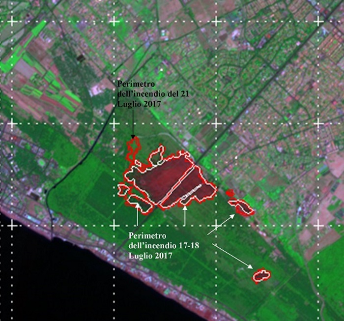 Il 17 luglio scorso un grande incendio è divampato nella riserva naturale di Castel Fusano (litorale romano) distruggendo una vasta area di pineta. Il 21 luglio un secondo incendio ha di nuovo colpito la riserva con importanti danni alla vegetazione (circa 200ettari di pineta e macchia mediterranea). Dalla combinazione delle immagini satellitari (Sentinel2A-MSI e il gemello americano Landsat 8-OLI) i ricercatori dell’Istituto Nazionale di Geofisica e Vulcanologia (INGV) hanno identificato le aree bruciate, nella loro successione temporale, facendo una fotografia sull’area danneggiata e delineandone il perimetro, sullo stato di degradazione e ponendo le basi per le future attività di monitoraggio della ricrescita della vegetazione.