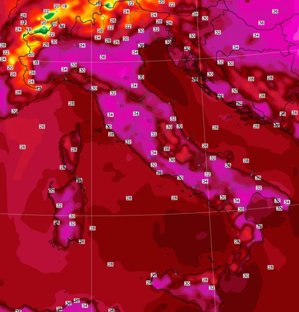 Dopo un inizio settimana con temperature estive ma gradevoli, l’alta pressione sembra intenzionata a spingerci di nuovo verso il caldo intenso: nei prossimi giorni infatti temperature e afa saliranno, con le massime che quasi ovunque oltrepasseranno i 30 gradi fino a spingersi localmente anche sui 36-37 gradi. La giornata più calda sarà quella di venerdì, e la calura (come mostra anche la mappa elaborata dal nostro modello) si farà sentire soprattutto nella parte centrale della Valpadana (in particolare Bassa Lombardia, Emilia e pianura veneta), nelle zone interne del Centro (specie in Toscana e Umbria) e più giù nelle regioni del versante ionico e nell’interno delle Isole Maggiori. Tra le città più calde quindi anche Bologna, Verona, Firenze e Perugia.