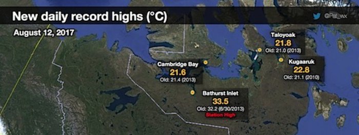 Il 12 agosto, la località più calda è stata quella di Bathurst Inlet dove la colonnina di mercurio è salita fino a 33,5°C, infrangendo il record di questa stazione meteorologica che era di 32,2°C, stabilito nel 2013.