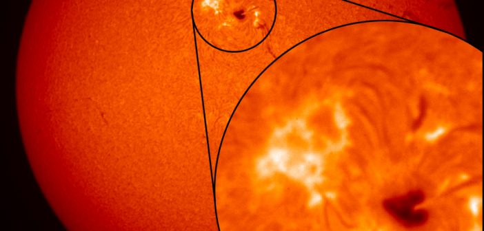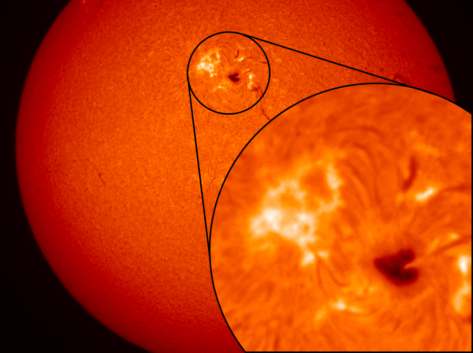 «Il Sole è l’unica stella (per adesso…) della quale riusciamo a osservare i dettagli della superficie. Le macchie solari, che sono la caratteristica più particolare quando si osserva il Sole (ovvero, la fotosfera del Sole), sono formate da una regione più scura detta ombra e una attorno ad essa, detta penombra. Tutt’attorno si vedono dei grani, dovuti al ribollire (ovvero, alla convezione) del plasma nelle regioni indisturbate della fotosfera. Questo fenomeno prende il nome di “granulazione del Sole quieto”. Occasionalmente, all’interno dell’ombra delle macchie appaiono una o più strutture brillanti che separano più o meno nettamente l’ombra in più regioni scure, talvolta a partire dalla zona di Sole quieto al bordo della macchia stessa».