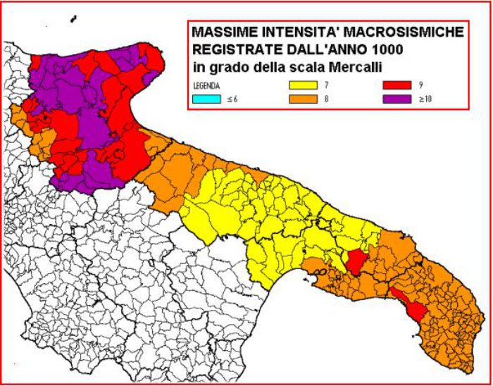 La Puglia, pur non essendo tra le regioni italiane considerate in assoluto a maggior rischio sismico, è stata interessata nel passato da eventi catastrofici di elevato livello, con distruzione di intere cittadine e numerose vittime. Ciò è imputabile sia alla sua vicinanza con zone sismogenetiche importanti (l’Appennino) sia alla presenza nel suo territorio di sorgenti in grado di scatenare attività sismica oltre la soglia del danno.