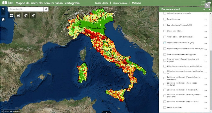 Un quadro informativo integrato liberamente fruibile online, composto da due sezioni distinte: “Indicatori” e “Cartografia”. Come spiegano dall’Istat, la «sezione “Indicatori” consente la visualizzazione e l’estrazione di oltre 140 variabili a livello comunale relative a: superficie e altre caratteristiche territoriali; rischio sismico, idrogeologico (frane e alluvioni) e vulcanico; stato degli edifici a uso residenziale e delle abitazioni (tipo di materiale utilizzato per la costruzione, numero dei piani fuori terra, epoca di costruzione dei fabbricati e distribuzione delle abitazioni per tipologia di occupanti); numero dei beni culturali presenti nel territorio comunale; indicatori demografici di contesto, quali variazione della popolazione, densità abitativa, indici di vecchiaia e di dipendenza strutturale, vulnerabilità sociale e materiale e numerose altre variabili. È anche possibile visualizzare e scaricare un report di sintesi che fornisce un colpo d’occhio sullo stato dei rischi naturali dei Comuni italiani, anche attraverso visualizzazioni grafiche. La sezione “Cartografia” permette invece di produrre mappe interattive delle variabili a livello comunale su oltre 20 principali tematiche informative».