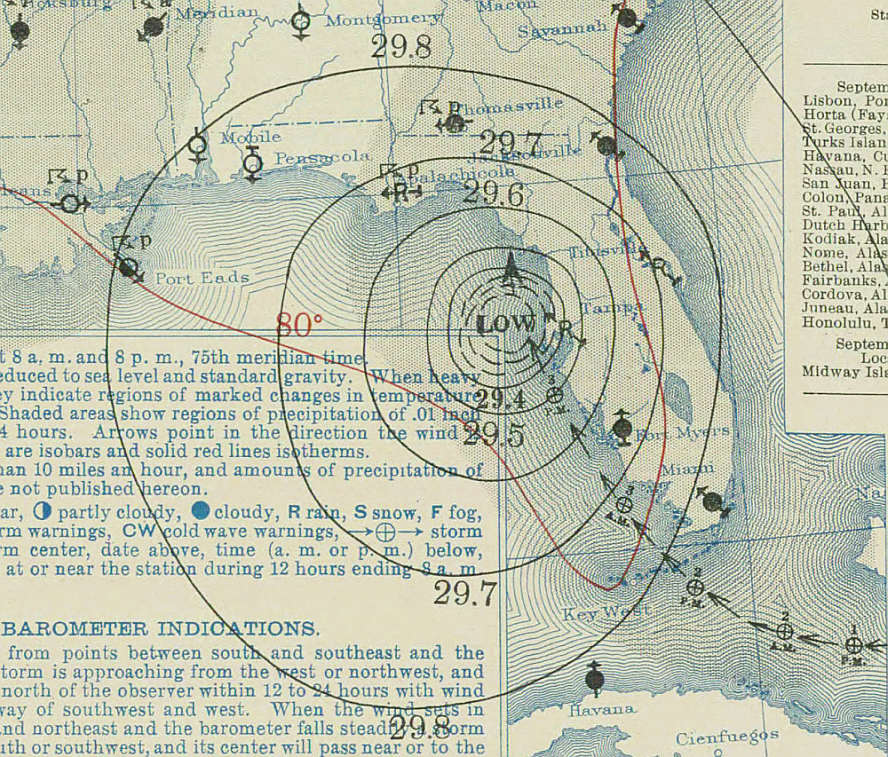 Mentre passava su Long Key (Florida) nel nucleo di questo uragano venne misurato un minimo di pressione di 892 mb, il che lo rende decisamente il più intenso uragano che abbia mai colpito gli Stati Uniti da quando sono disponibili osservazioni scientifiche del fenomeno, e il terzo fra tutti gli uragani atlantici, superato solo da Wilma, che nel 2005 fece registrare un minimo di 882 hPa, e da Gilbert, che nel 1988 raggiunse un minimo di 888 mb.