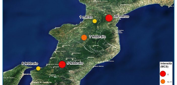 I cerchi colorati corrispondono agli epicentri dei 5 terremoti più forti della lunga sequenza sismica del 1783 (5 febbraio, 6 febbraio, 7 febbraio, 1 marzo e 28 marzo). Il colore e le dimensioni dei cerchi indicano la massima intensità osservata Imax (Fonte: CPTI11).