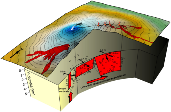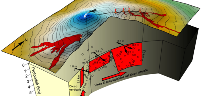 “Il magma”, spiega Alessandro Bonaccorso, dirigente di ricerca INGV, “viene trasportato nella crosta tramite intrusioni, anche note come dicchi, che nella loro risalita fendono le rocce incassanti sino a raggiungere la superficie terrestre, per dare vita alle eruzioni. La propagazione dei dicchi provoca non solo deformazioni, ma anche notevole rilascio sismico, entrambi misurabili attraverso le reti geofisiche di monitoraggio permanente”.
