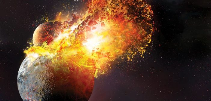 Simulazione della collisione fra due planetesimi. In giallo sono rappresentate le rocce fuse e in rosso gli elementi che stanno evaporando.