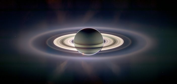 Questa immagine, assemblata tra i vari scatti di Cassini, mostra Saturno e il sole durante un’eclissi.