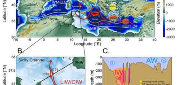 Come spiegano dall’Agenzia regionale per la protezione ambientale della Toscana, questo significa che nel Canale di Sicilia il flusso d’acqua proveniente dai due bacini si dispone su due livelli: l’acqua di origine atlantica, meno salata e più leggera, occupa lo strato superficiale e si muove verso est, mentre quella intermedia generata dall’intensa evaporazione nella regione orientale, più pesante, si muove verso il bacino occidentale nello strato inferiore.