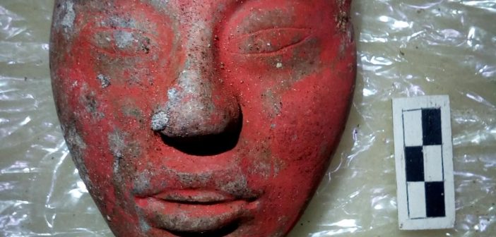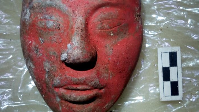 Una maschera di giada pitturata di rosso con il vermiglione è stata trovata durante gli scavi. La parte alta ritrae un simbolo che indica l’affiliazione con il Dio del Mais.