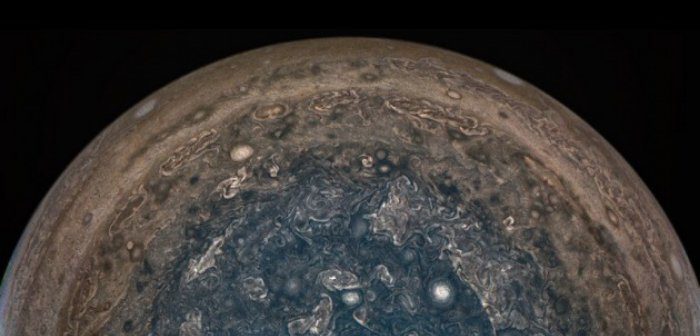 0La sonda spaziale Juno della NASA sta rivelando sempre più particolari delle attività di Giove. Gli ultimi dati analizzati documentano che le bande di venti vorticosi si estendono per migliaia di chilometri nelle profondità del pianeta, mentre ancora non sono chiari i processi fisici che dominano la dinamica delle tempeste che si ammassano sui poli e nord e sud