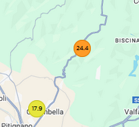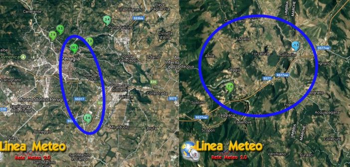Esempio di inversione termica nei valori registrati l’11 agosto 2025, tra la frazione di Colombella (PG), posta a circa 304 metri slm e di Casacce di Belvedere (PG), a 597 metri. Sono esattamente 6.5°C di differenza con queste condizioni di alta pressione, in piena estate, con anticiclone africano che estende la sua influenza sull’Umbria